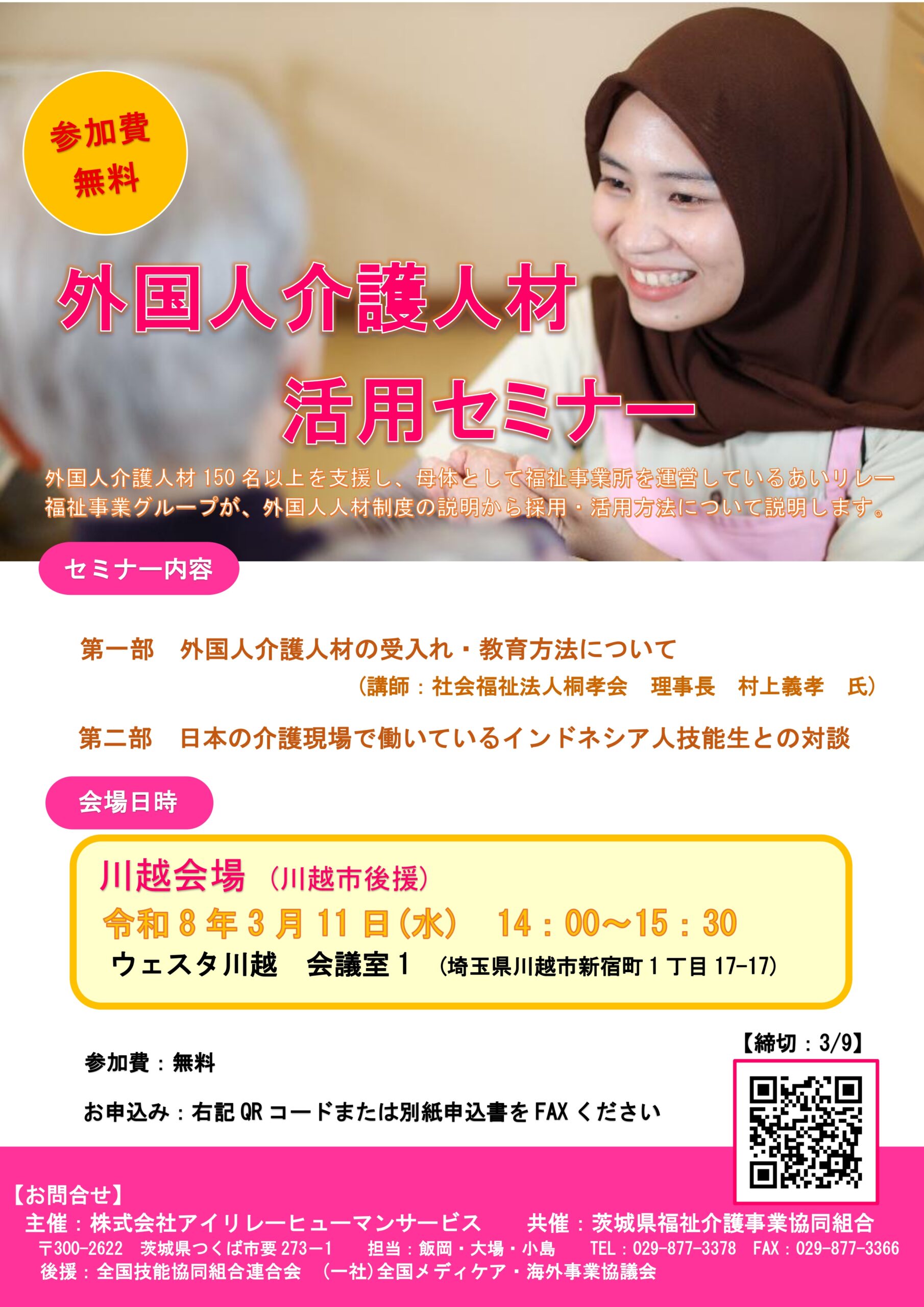 3月セミナーを埼玉県川越市にて開催決定!外国人介護人材150名以上を支援し、母体として福祉事業所を運営しているあいリレー福祉事業グループが、外国人人材制度の説明から採用・活用方法について説明します。外国人介護人材活用セミナー26年3月開催PDFダウンロード外国人介護人材活用セミナー26年3月開催_開催案内ダウンロード
